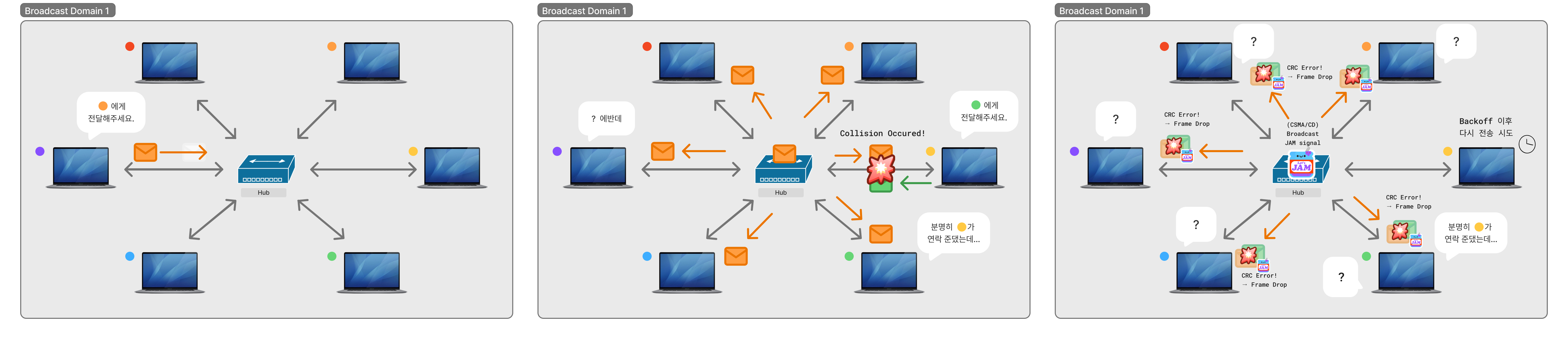 우선 허브로 메시지가 도착하면 연결된 모든 경로로 브로드캐스트가 일어난다. 이 과정에서 다른 트래픽의 전송을 시도하면 충돌이 발생하게 된다. CSMA/CD에 의해 충돌이 발생했다는 사실 자체는 감지되고, 깨진 트래픽과 JAM 신호가 브로드캐스트된다. 수신한 노드 측에서 CRC 검증 오류 또는 JAM 패킷에 의해 수신한 데이터의 폐기가 일어난다.