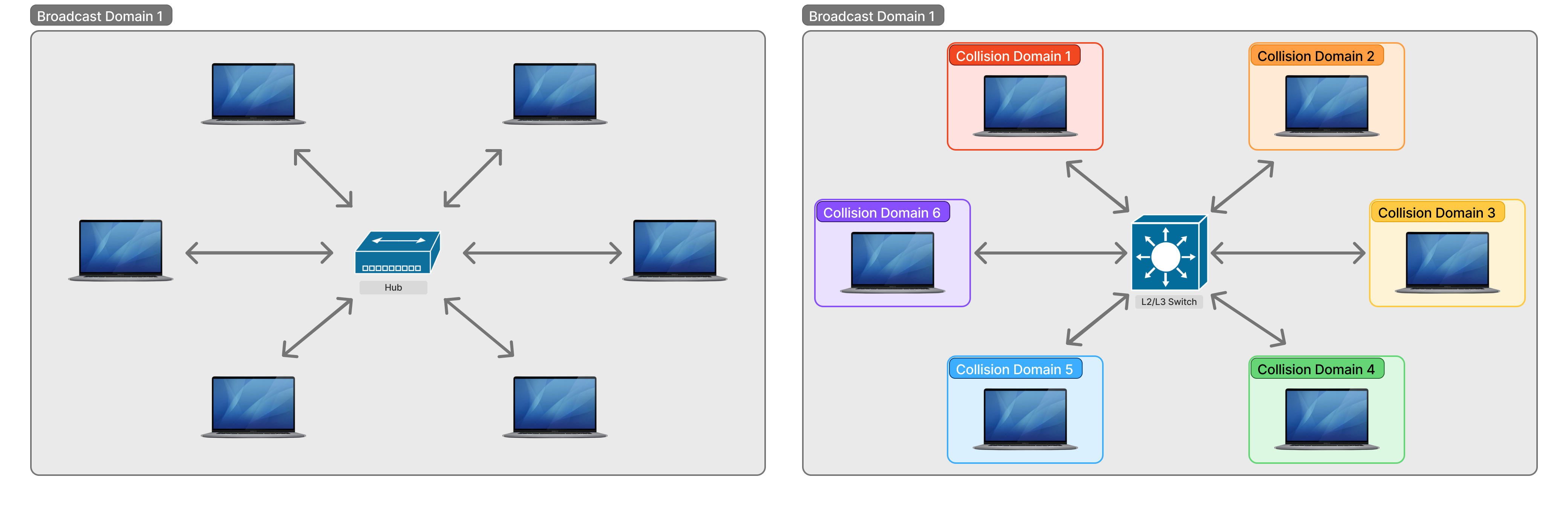 Collision Domain이란, 말 그대로 충돌이 발생할 수 있는 영역을 구분하기 위한 개념이다. 위에서 언급한 Half/Full Duplex처럼 여러 패킷이 동일한 라인을 통해 이동하기 때문에, 경로 상에서 서로 다른 트래픽이 동시에 지나가려고 할 때, 서로 충돌이 일어나 손실이 일어날 수 있는 영역 (Domain) 단위를 의미한다.