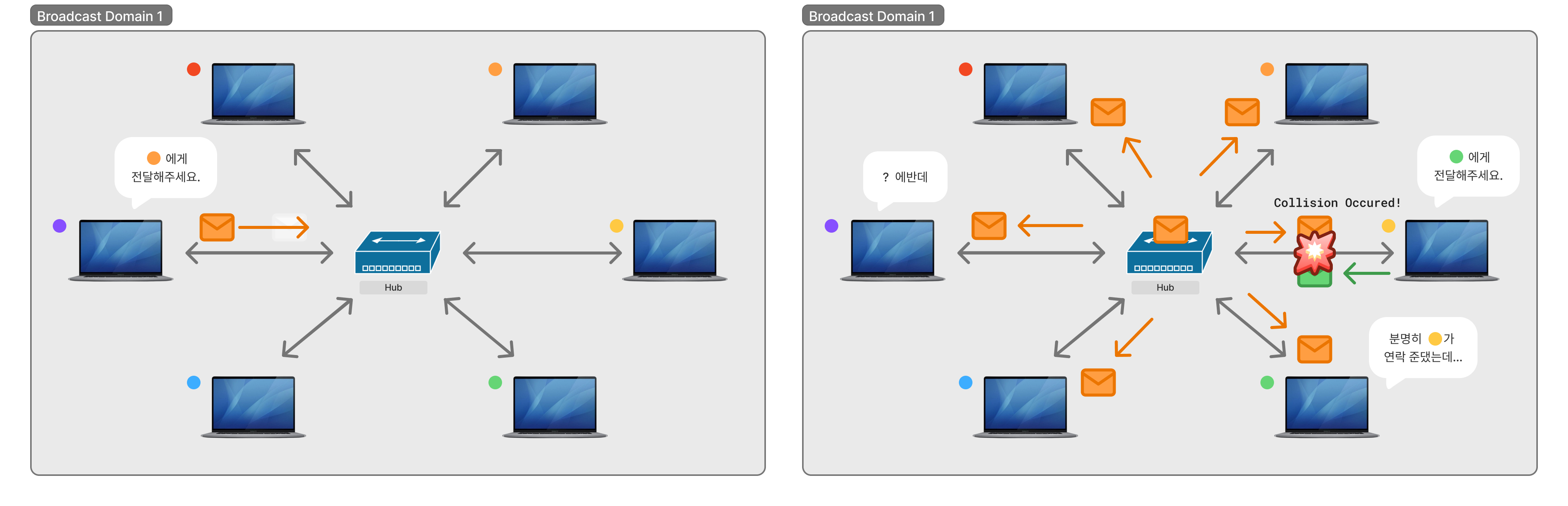 허브와 스위치를 구분하기 위해서는 OSI 7 Layer 개념을 가져올 필요가 있다. 허브는 물리 계층이 L1 수준에서 작동하는 리피터(Repeater)이다. 수신한 데이터를 그대로 복제하고, 내보낼 수 있는 모든 포트로 브로드캐스트하는 방식으로 작동한다. 다시 말해, 연결된 장치의 MAC 주소를 관리하거나 인식하지 못하며, 동시에 여러 포트에서 데이터가 전송될 경우에는 어느 위치에서든 충돌이 발생할 수 있다. 이처럼 충돌이 일어날 수 있는 구역을 하나의 Collision Domain이라고 부른다. 허브와 스위치의 Collision Domain을 도식으로 나타내면 아래의 그림과 같이 표현할 수 있다. 허브에서는 모든 포트가 오직 하나의 Collision Domain을 공유한다.