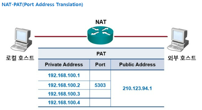PAT에서는 하나의 공인 ip를 여러 대의 장치에서 사용 가능하도록 설계하는 방법을 다룬다. 하나의 공인 ip로 들어오는 요청을 여러 개의 사설 ip로 뿌려주기 위해 포트 개념을 가져와 활용한다. 때문에 ip (L3)만 사용하는 나머지 두 방식과 다르게 L4의 포트 개념을 가져오게 된다는 특징을 가진다.
