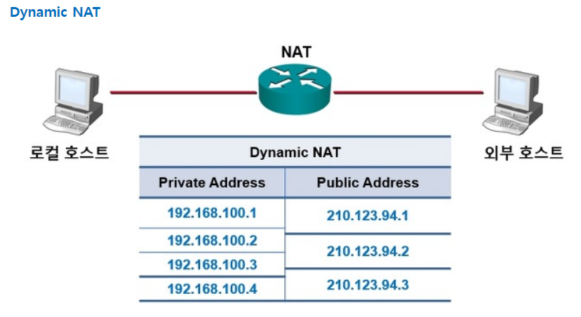 Dynamic NAT에서는 사설 ip와 대응되는 공인 ip가 1대1이 아닌 경우를 말하며, 물론 일반적인 경우에는 공인 ip쪽이 적은 쪽인 경우가 많다. DNAT에서는 가용 공인 ip를 풀 (pool)에 담아두고, 사설 ip를 부여받은 개별 장치로부터 새로운 요청이 들어올 때마다 풀에서 공인 ip를 꺼내고 맵핑을 생성하는 방식으로 작동한다. 때문에 사설 ip와 공인 ip가 고정적으로 매칭되지 않는다. 부족한 공인 ip를 여러 대의 장치에서 사용하기 위해 사용하는 것이 일반적인 용례이다.