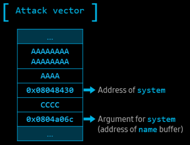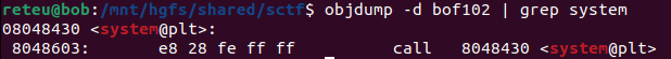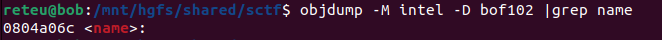 system("/bin/sh")을 호출하기 위해 bofme()에서의 ret 영역에 system() 함수의 주소값을 적고, 전역변수인 name에 "/bin/sh"을 입력하여 전달할 계획이다. 각각의 주소는 objdump와 같은 명령어를 통해 바이너리를 대상으로 점프를 뜨면 확인할 수 있다.