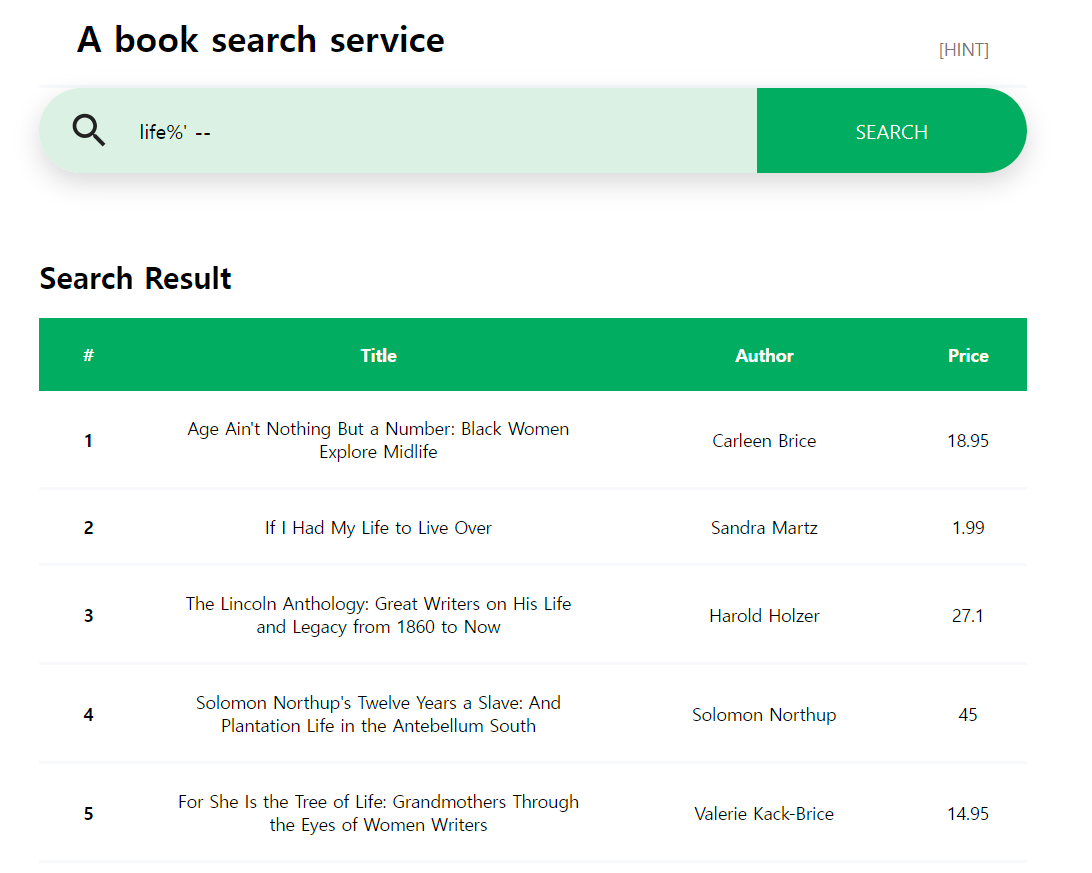 like 구문을 이용하고 있다. 주석 처리를 통해 SQL injection이 가능한지 확인해보자. SQLi가 가능하다면 검색 결과가 정상적으로 표출될 것이다.