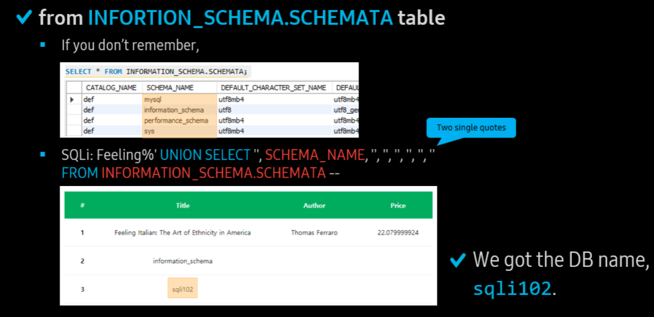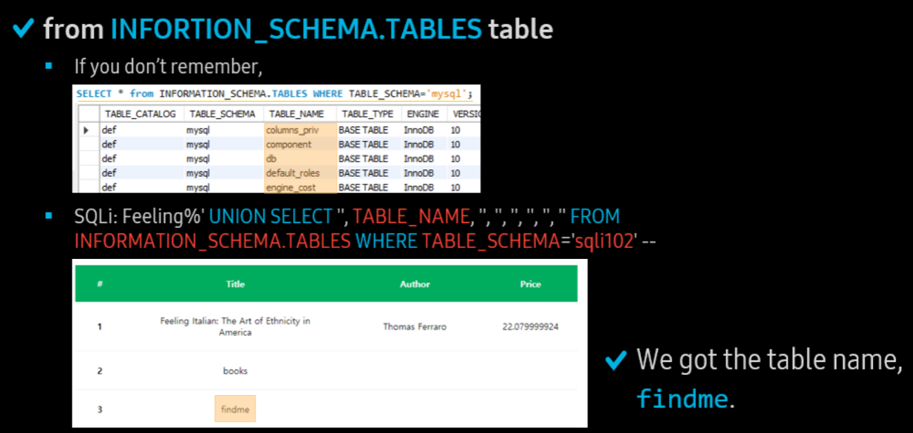이제 컬럼의 수를 찾았으니, DB, 테이블 이름과 컬럼 이름을 알아낼 차례이다. 이를 알아내기 위해서는 INFORMATION-SCHEMA를 이용하면 된다.