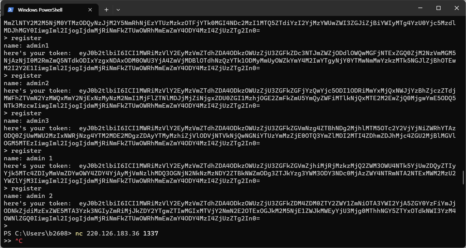각 토큰은 Base64로 인코딩 되어있는데, 디코딩할 경우 token과 IV (initial vector) 값이 JSON 형식으로 작성되어 있다. 모든 경우에서 IV 값은 동일하고, 토큰 값의 첫 블럭과 맨 마지막 블럭의 값 역시 동일하다. 첫 블럭은 EBC, 그 다음부터는 CBC로 암호화 하는데, 첫 블럭의 값은 항상 일정하므로 사실상 CBC 모드로만 암호화 하는 것과 동일하다. 때문에 admin으로 가입했을 때의 토큰 값을 알아내기 위해서는 admin과 유사한 계정을 여러 개 만들어 패턴을 파악한 다음, 역으로 admin의 토큰 값을 추정해내면 된다.