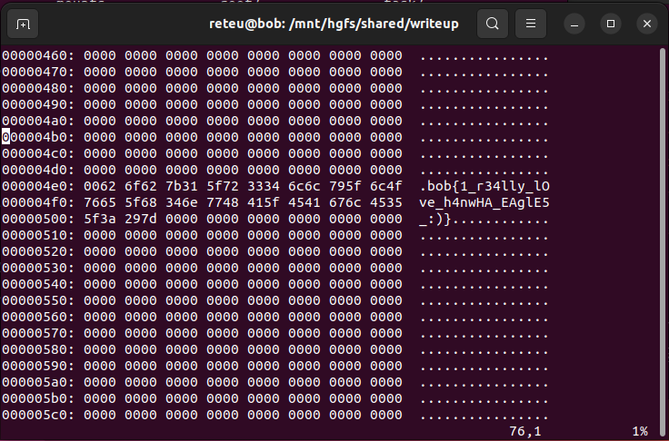 vim에서 xxd로 진입하거나, 헥스 에디터로 오픈해보명 아래와 같이 플래그를 확인할 수 있다.