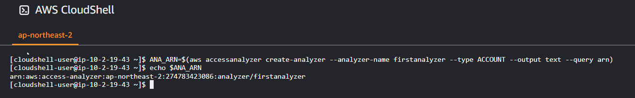 ANA_ARN=$(aws accessanalyzer create-analyzer --analyzer-name firstanalyzer --type ACCOUNT --output text --query arn)