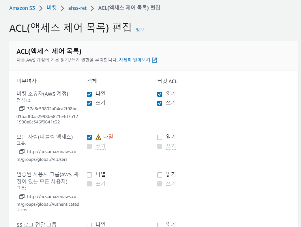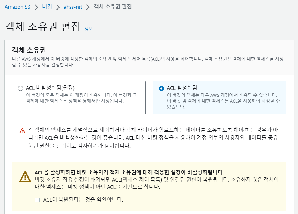 κ°μ₯ λ¨Όμ κ°μ²΄ ACLμ λλ€. κ°μ²΄ ACLμ μ¬μ©μ AWS μΈ‘μμλ 곡μμ μΌλ‘ λΉκΆμ₯νκ³ μλλ°, κ·Έ μ΄μ λ κ°μ²΄λ³λ‘ ACLμ κ΄λ¦¬ν κ²½μ° μ λλ‘ κ΄λ¦¬κ° μ΄λ£¨μ΄μ§μ§ μλ μΌμ΄μ€κ° λ§€μ° λ§κΈ° λλ¬ΈμΌλ‘, λ°λμ κ° κ°μ²΄μ λν μ κ·Ό κΆνμ κ°λ³μ μΌλ‘ μ μ΄ν΄μΌλ§ νλ κ²½μ°κ° μλλΌλ©΄ λ²ν· μ μ± μ ν΅ν΄ λ€λ₯Έ μ¬μ©μμ μ κ·Ό κΆνμ κ΄λ¦¬νλλ‘ μ€λΈμ νΈλ₯Ό 곡μ νλλ‘ κΆμ₯νκ³ μμ΅λλ€. κ°μ²΄ ACLμ μ€μ λ³κ²½μ 'S3 > λ²ν· > [λ²ν· λͺ ] > κΆν (ν) > κ°μ²΄ μμ κΆ (λΈλ‘) > νΈμ§' μ ν΅ν΄ μ κ·Ό κ°λ₯ν©λλ€. S3 λ²ν·μ μ²μ μμ±νκ³ λλ©΄ κΈ°λ³Έμ μΌλ‘ νΌλΈλ¦ μ κ·Ό κΆνμ΄ λͺ¨λ μ°¨λ¨λμ΄ μμ±λ©λλ€.