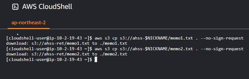 aws s3 cp s3://ahss-$NICKNAME/memo1.txt . --no-sign-request