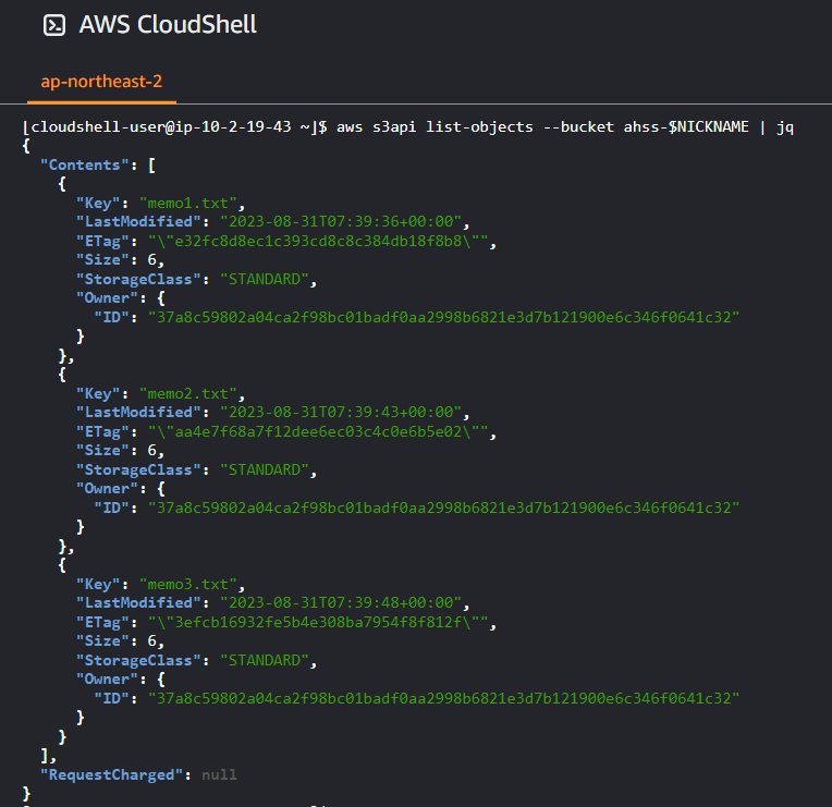 aws s3api list-objects --bucket ahss-$NICKNAME | jqβ