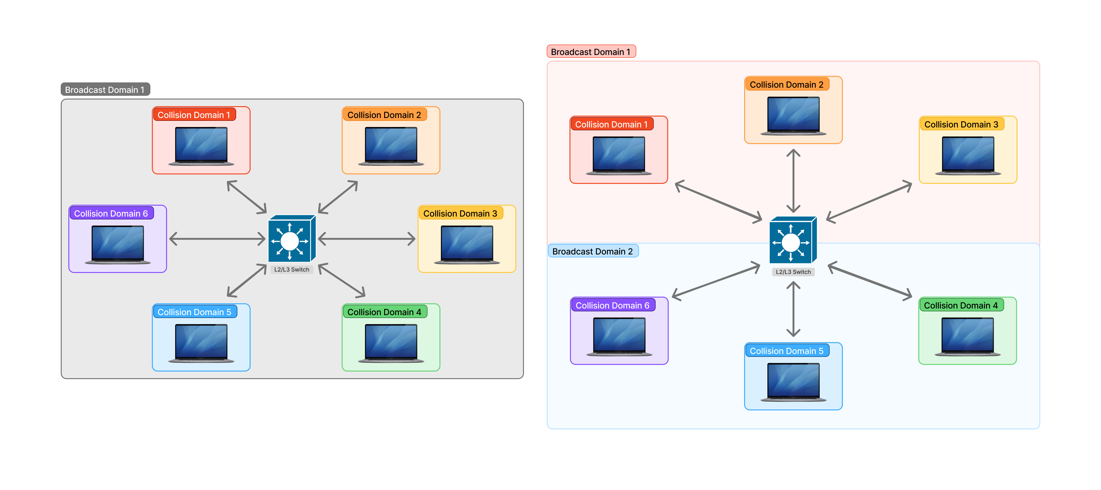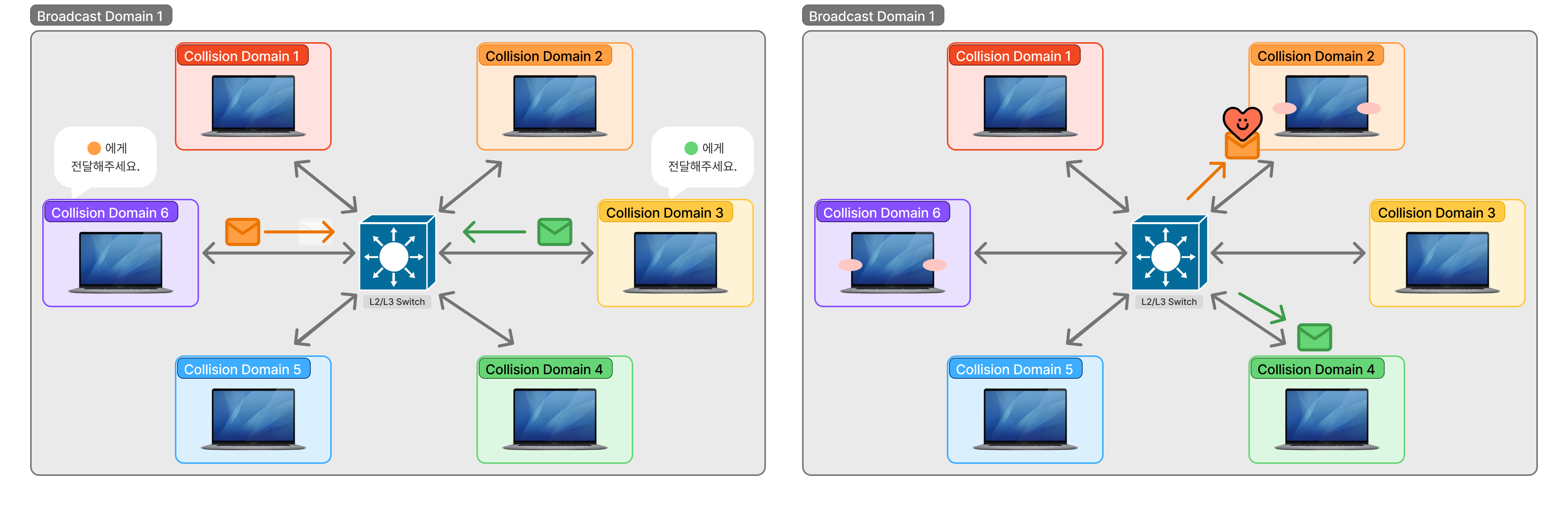 스위치에서는 유형에 따라 CAM Table 또는 ARP Table를 활용한 스위칭을 지원하기 때문에 허브에서라면 충돌이 발생할 수 있는 상황에서도 충돌이 일어나지 않는 모습을 확인할 수 있다. 따라서, 각 세그먼트가 각각의 고유한 콜리전 도메인을 가진다고 볼 수 있다. 하지만 여전히 모든 노드가 스위치를 통해 하나의 네트워크를 이루고 있기 때문에 브로드캐스트 도메인은 여전히 전체가 하나로 묶여 있다.