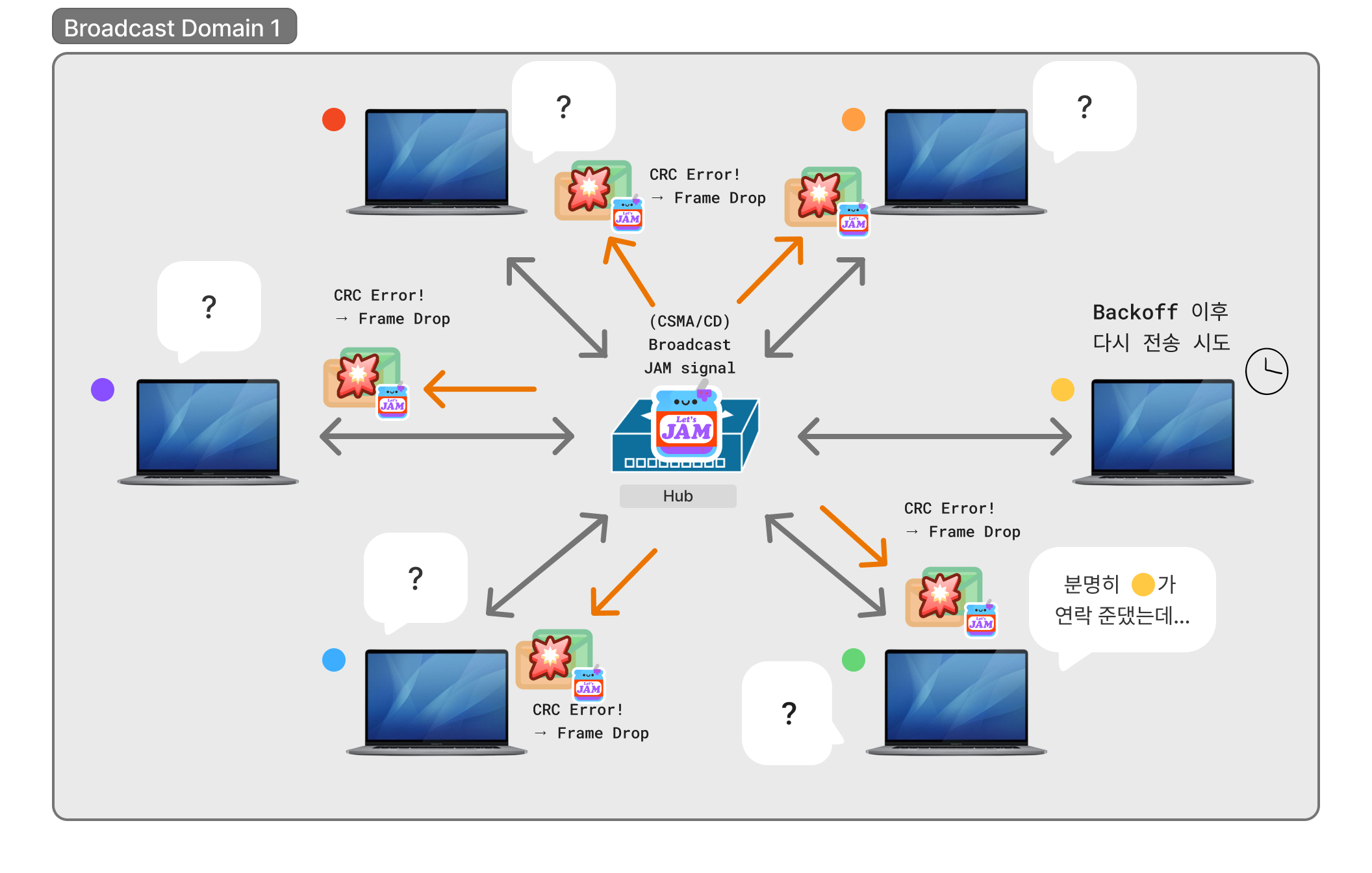우선 허브로 메시지가 도착하면 연결된 모든 경로로 브로드캐스트가 일어난다. 이 과정에서 다른 트래픽의 전송을 시도하면 충돌이 발생하게 된다. CSMA/CD에 의해 충돌이 발생했다는 사실 자체는 감지되고, 깨진 트래픽과 JAM 신호가 브로드캐스트된다. 수신한 노드 측에서 CRC 검증 오류 또는 JAM 패킷에 의해 수신한 데이터의 폐기가 일어난다.