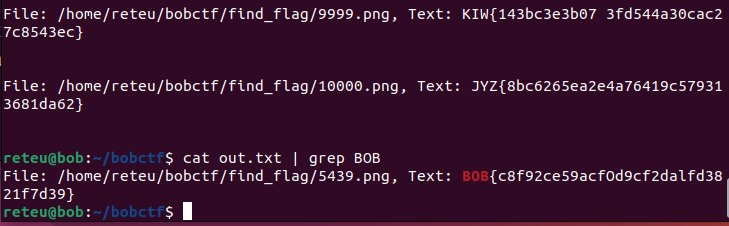 코드를 작성할 때에는 사진 속 이미지의 대/소문자 형식과 플래그의 포맷을 참고해서 ' BOB{ '가 존재하는 이미지를 찾으면 되겠다.